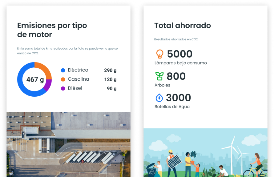 A partir del tipo de motor, el tipo de combustible, la distancia recorrida y la carga transportada de cada vehículo de tu flota, el dashboard realiza un cálculo preciso de las emisiones de dióxido de carbono, gas metano y gas invernadero generados.