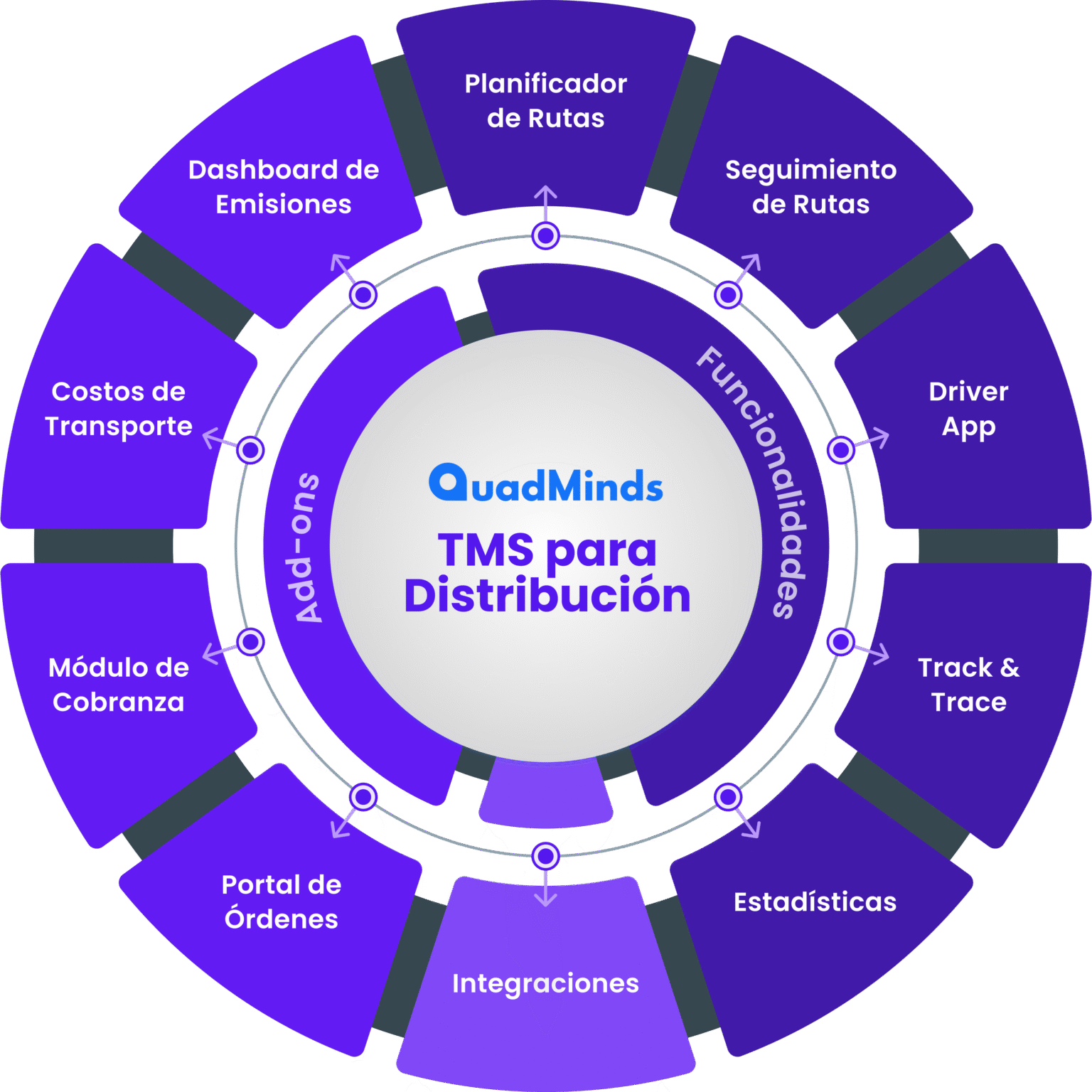 Nuestro TMS para Distribución (urbana de mercancías / Última milla) incluye Planificador, Seguimiento de Rutas, Driver App, Integraciones, Estadísticas, Track & Trace, Portal de Órdenes, Dashboard de Emisiones y Módulo de Cobranzas como Add Ons.